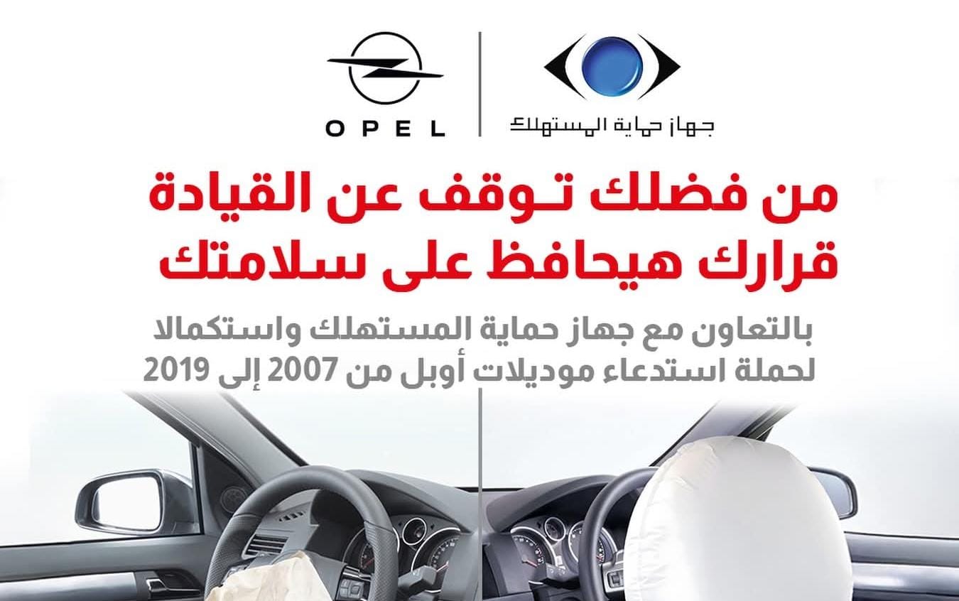 كشفت شركة المنصور للسيارات، وكيل العلامة التجارية أوبل OPEL في مصر، عن تنفيذ حملة استدعاء لعدد من سيارات أوبل المُنتجة خلال الفترة من 2007 وحتى 2019، وذلك بالتنسيق مع جهاز حماية المستهلك، على خلفية رصد عيب تصنيعي في الوسائد الهوائية من نوع تاكاتا قد يؤثر على كفاءة عملها ويشكل خطورة على سلامة قائدي المركبات.