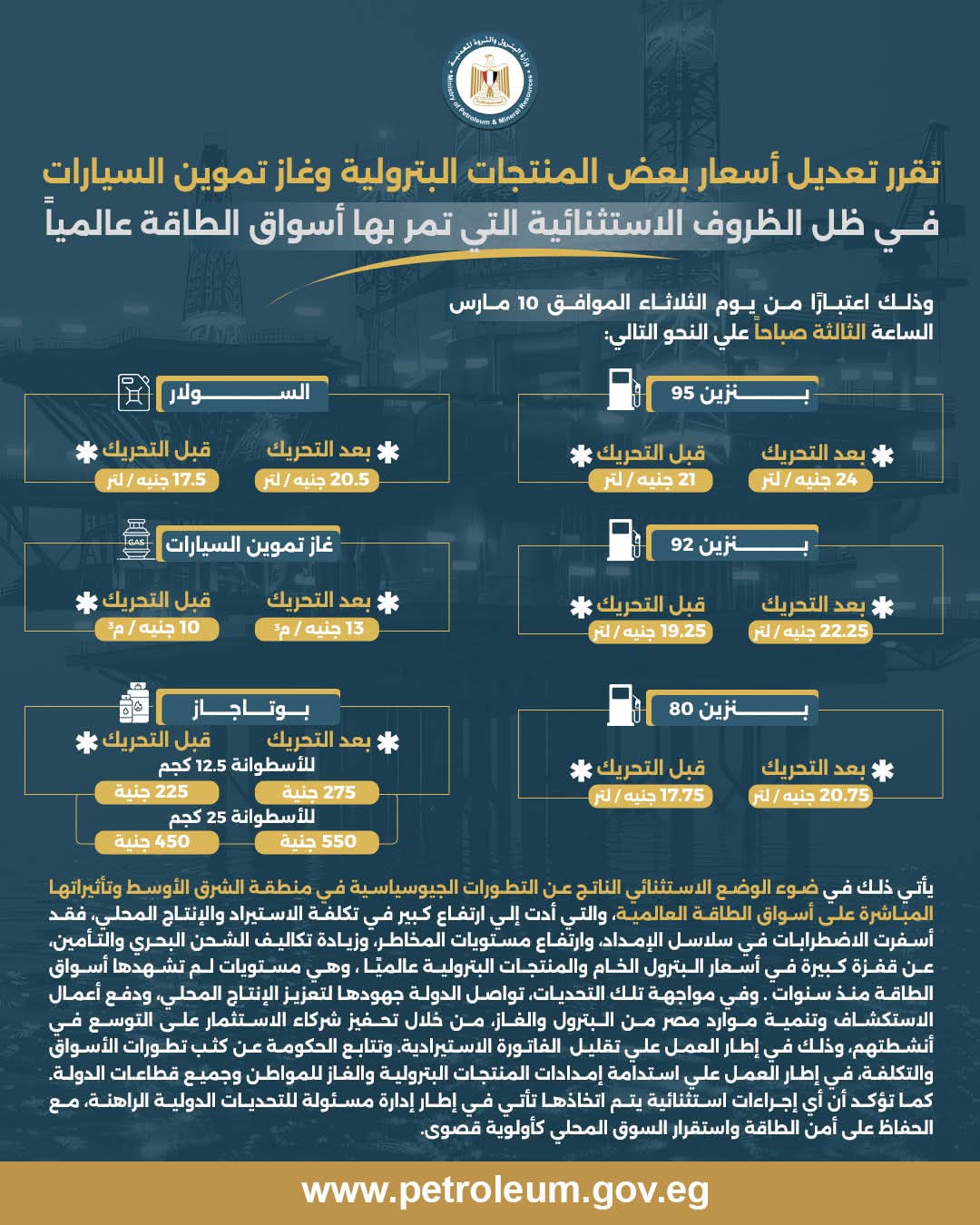 وأوضحت وزارة البترول أن القرار يأتي في ضوء التطورات الجيوسياسية في منطقة الشرق الأوسط وما نتج عنها من تداعيات مباشرة على أسواق الطاقة العالمية، حيث أدت الاضطرابات في سلاسل الإمداد وارتفاع مستويات المخاطر إلى زيادة تكاليف الشحن البحري والتأمين، وهو ما انعكس في قفزة كبيرة بأسعار البترول الخام والمنتجات البترولية عالميًا، لتصل إلى مستويات لم تشهدها الأسواق منذ سنوات.