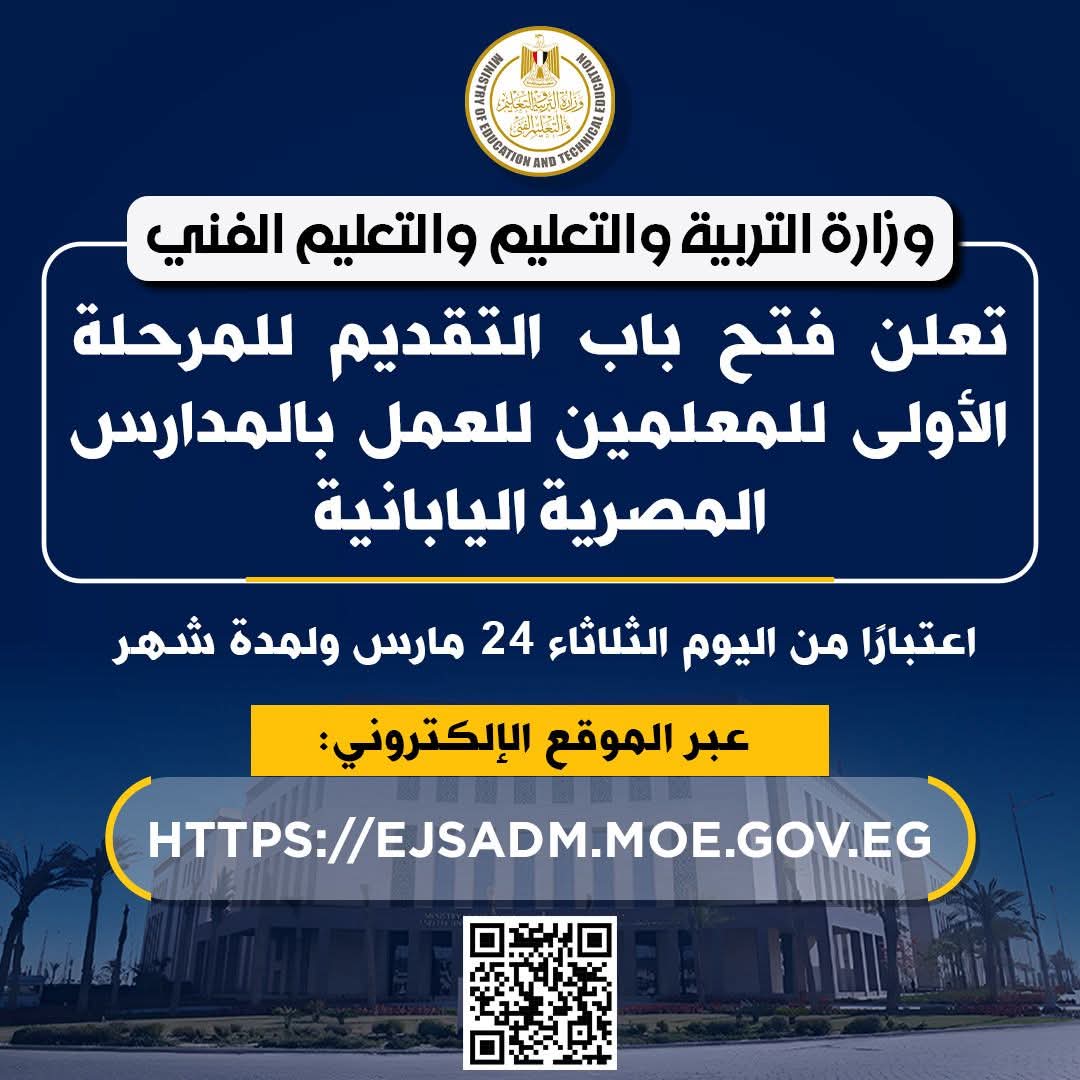 أعلنت وزارة التربية والتعليم والتعليم الفني فتح باب التقديم للمرحلة الأولى للمعلمين الراغبين في العمل بالمدارس المصرية اليابانية، اعتبارًا من اليوم الثلاثاء 24 مارس ولمدة شهر، وذلك عبر الموقع الإلكتروني المخصص للتقديم، في إطار خطة الدولة للتوسع في هذا النموذج التعليمي على مستوى الجمهورية.