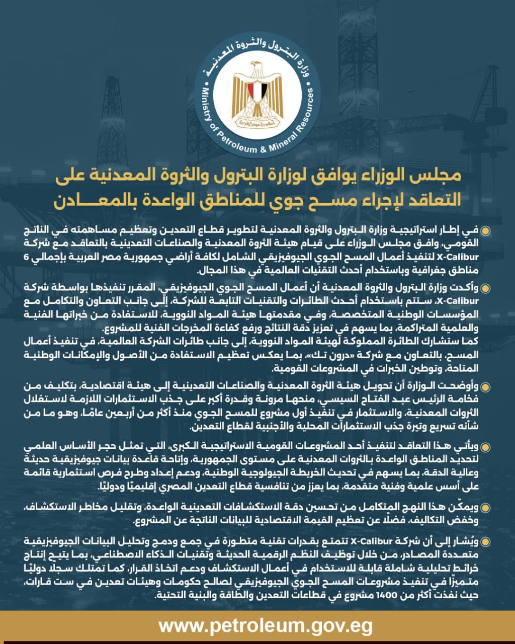 وافق مجلس الوزراء على قيام هيئة الثروة المعدنية والصناعات التعدينية التابعة لوزارة البترول والثروة المعدنية بالتعاقد مع شركة X-Calibur لتنفيذ مشروع المسح الجوي الجيوفيزيقي الشامل لأراضي جمهورية مصر العربية، بهدف تحديد المناطق الواعدة بالثروات المعدنية وتعزيز فرص الاستثمار في قطاع التعدين.