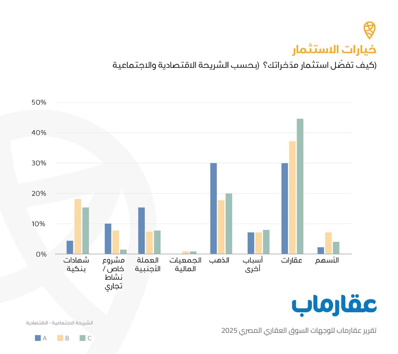رصد التقرير اختلافًا واضحًا في تفضيلات الاستثمار بين الفئات الاجتماعية المختلفة، حيث أظهرت النتائج أن الطبقة مرتفعة الدخل تركز بشكل رئيسي على الاستثمار في العقارات كخيار أول، يليها الاستثمار في العملات الأجنبية ثم الشهادات البنكية.