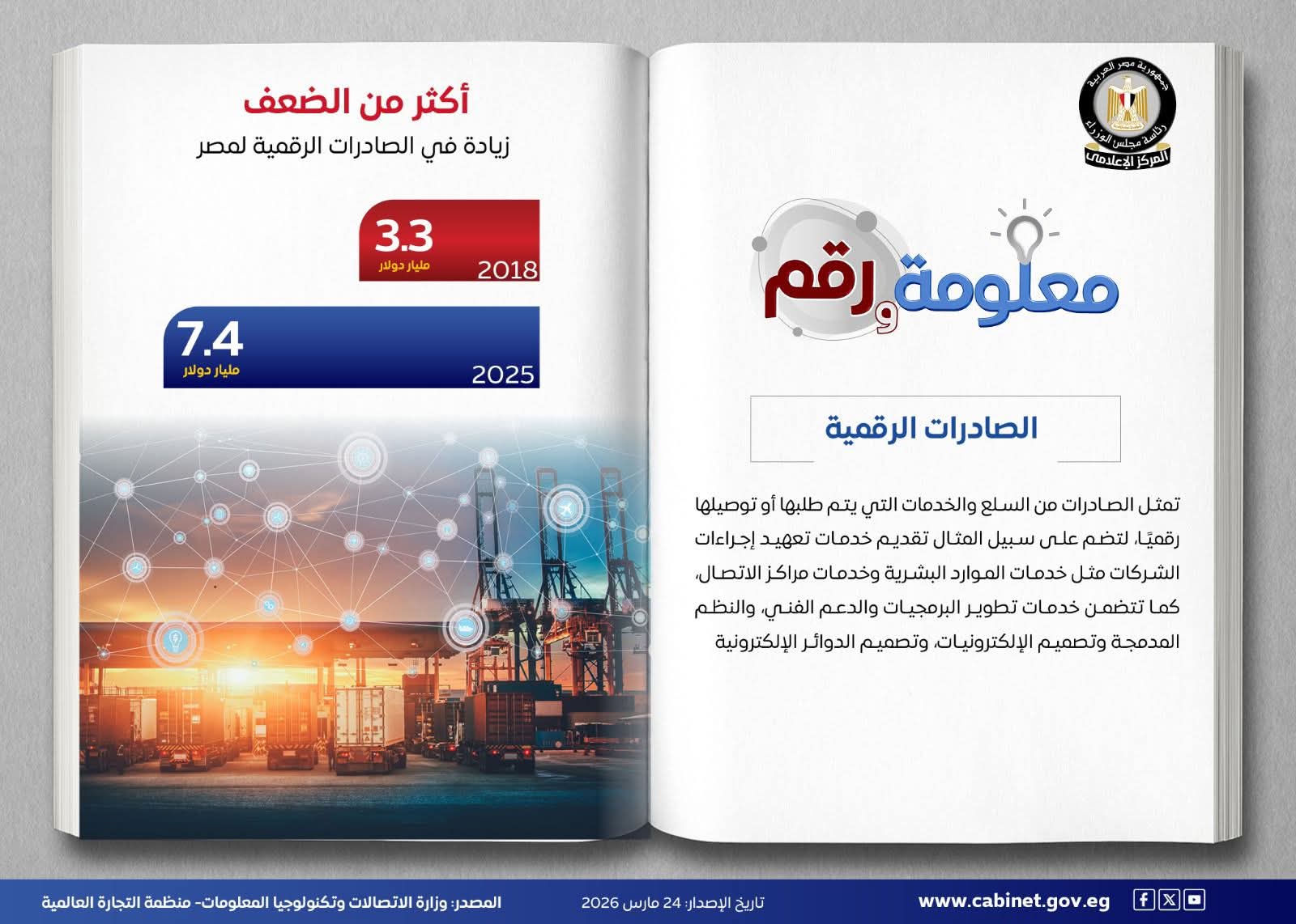 تواصل مصر تكثيف جهودها لتعزيز مكانتها في الاقتصاد الرقمي العالمي، عبر العمل على مضاعفة صادراتها الرقمية، التي سجلت نموًا لافتًا خلال الفترة من 2018 إلى 2025، لترتفع إلى 7.4 مليار دولار مقابل 3.3 مليار دولار، بزيادة تتجاوز الضعف.