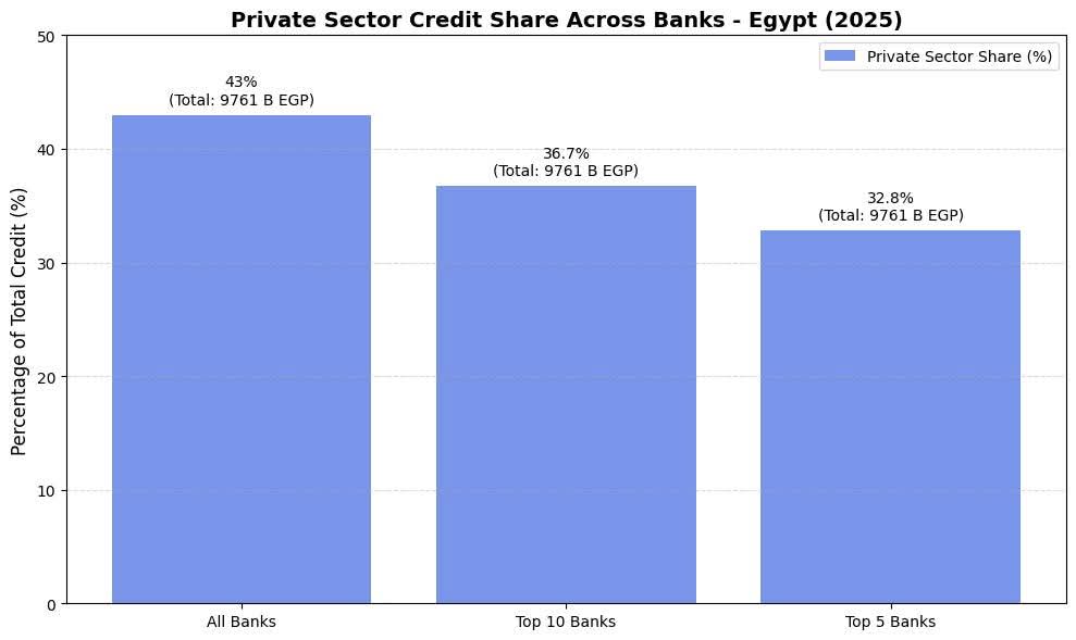 تحليل توزيع القروض بين البنوك الكبرى والصغرى يظهر أن حصة القطاع الخاص لدى أكبر 5 بنوك بلغت 32.8%، و36.7% لدى أكبر 10 بنوك، ويعكس هذا الفارق طبيعة عمل البنوك الكبرى، التي تميل إلى تمويل مشروعات ضخمة غالباً ما ترتبط بالقطاع العام أو المشاريع الاستراتيجية الكبرى، بينما توفر البنوك الأصغر مساحة أكبر لتوجيه التمويل للقطاع الخاص والمشروعات الصغيرة والمتوسطة.